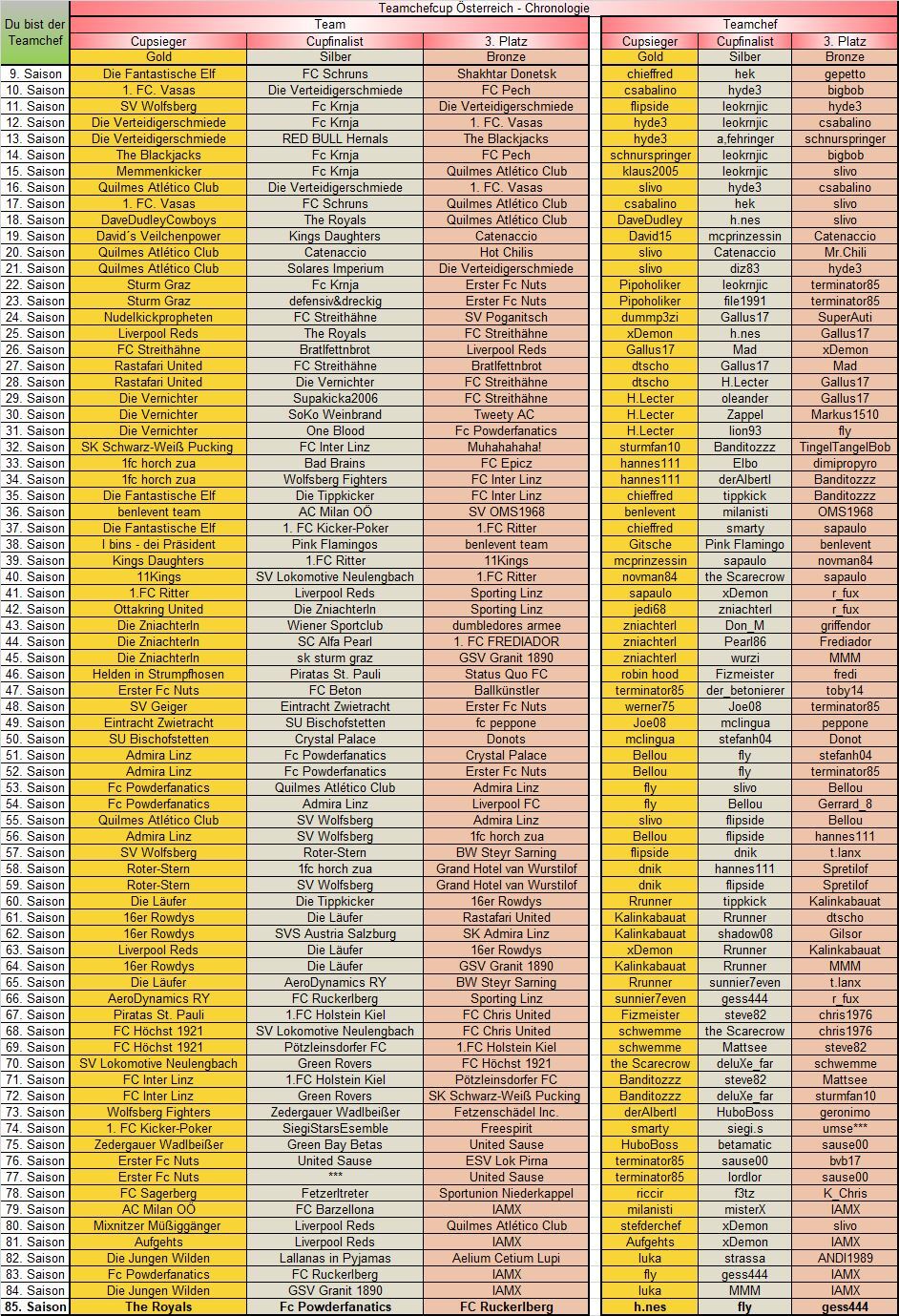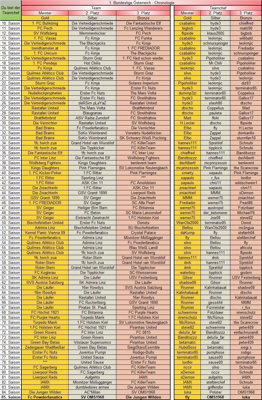 Die folgenden Chronologien bzw. Medaillenspiegeln zur 1. Buli und zum Teamchefcup werden jede Saison aktualisiert (Stand: 85. Saison).